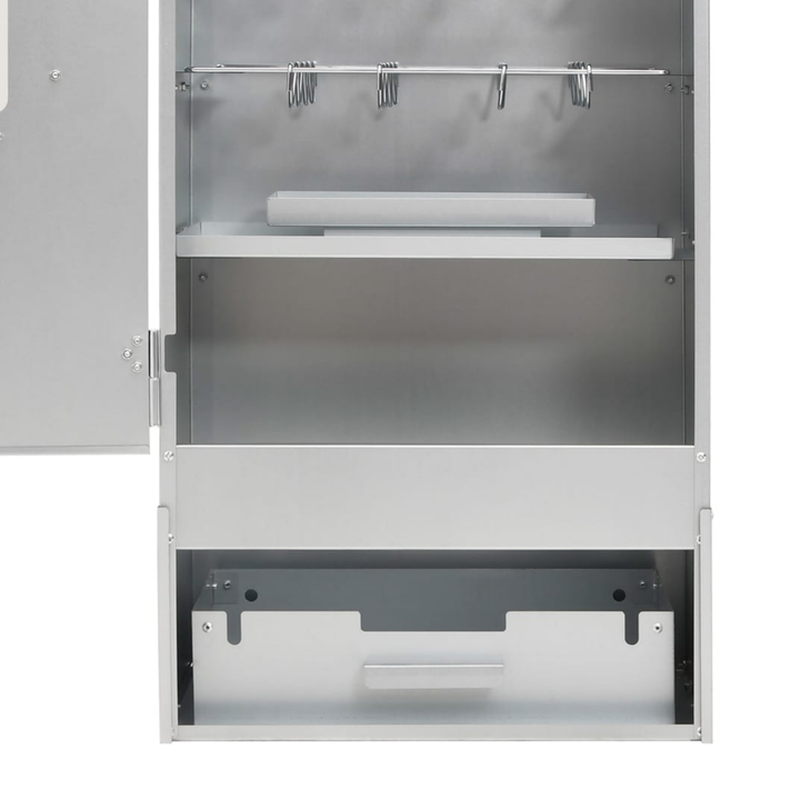 Уред за опушване на месо със стъкло неръждаема стомана е изработен от неръждаема стомана с дебелина 1мм. Горната му част представлява самата камера за опушване, където се поставят и готвят продуктите. Тя разполага с широка врата със стъкло. Вътрешната й част е оборудвана с 13 броя куки за месо, 15 броя шишове за куките. За допълнително улеснение при приготвянето на храната, вратичката разполага с отвор за поставяне на термометър. Термометърът е включен в комплекта. С него можете да следите каква е температурата във всеки един момент в уреда и на каква температура трябва да се приготвят различните видове меса. Най-отдолу има 1бр, тавичка, в която се събира мазнината при приготвянето на месото.