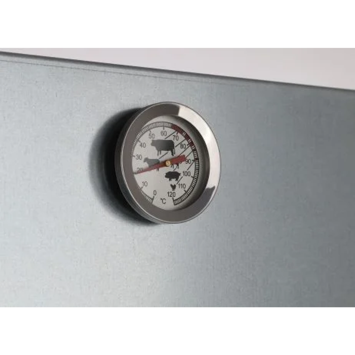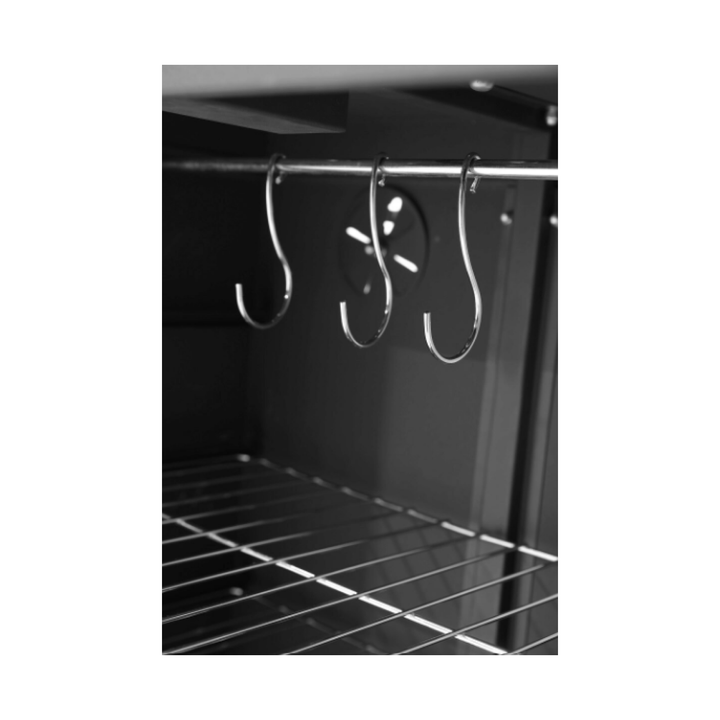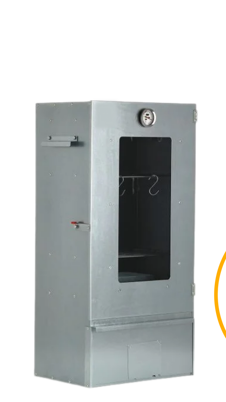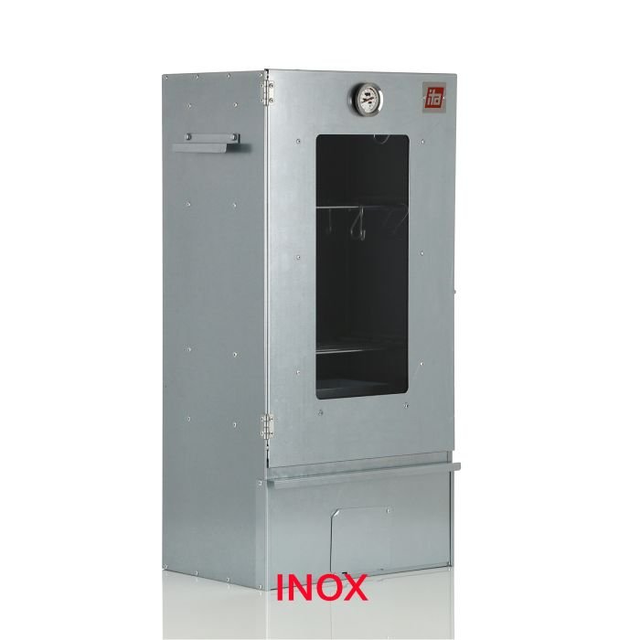 Уред за опушване на месо със стъкло поцинкован XL Уред за опушване на месо със стъкло поцинкован е изработен от поцинкована ламарина с дебелина 1мм. Горната му част представлява самата камера за опушване, където се поставят и готвят продуктите. Тя разполага с широка врата със стъкло. Вътрешната ѝ част е оборудвана с 8 13 бр. куки за месо,15 бр. шишове...