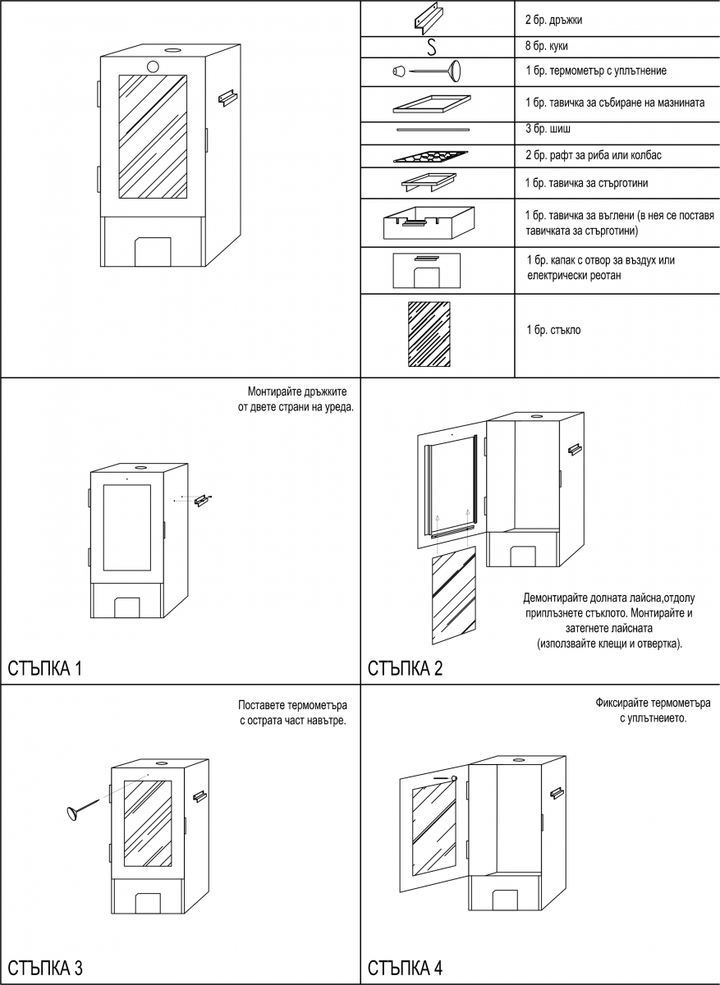 Уред за опушване на месо със стъкло поцинкован е изработен от поцинкована ламарина с дебелина 1мм. Горната му част представлява самата камера за опушване, където се поставят и готвят продуктите. Тя разполага с широка врата със стъкло. Вътрешната ѝ част е оборудвана с 8 13 бр. куки за месо,15 бр. шишове за куките. За допълнително улеснение при приготвянето на храната, вратичката разполага с отвор за поставяне на термометър. Термометърът е включен в комплекта. С него можете да следите каква е температурата във всеки един момент в уреда и на каква температура трябва да се приготвят различните видове меса. Най-отдолу има 1бр. тавичка, в която се събира мазнината при приготвянето на месото.