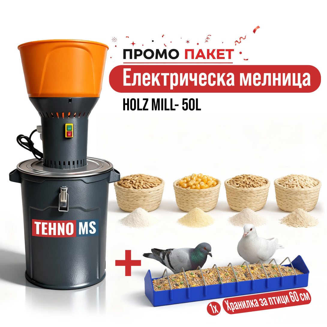 Електрическа мелница HOLZ MILL- 50L СИВ Мелницата за зърно HOLZ MILL- 50Л СИВ е предназначена за смилане на зърнени култури като царевица, пшеница, слънчогледови семена, овес и ечемик, както и на захар и сол. Тази фуражомелка HOLZ MILL 50L помага за получаване на смеси за птици и животни, които могат да се използват веднага или да се съхраняват и използват...