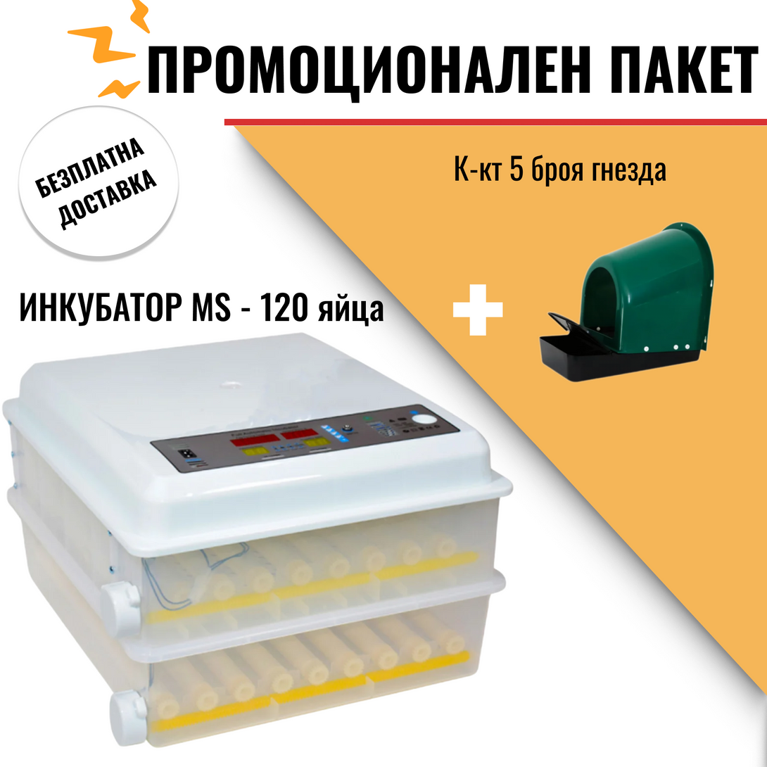Инкубатор за яйца MS-120 (DC 12V / AC 220V) + К-кт 5 броя Гнезда за кокошки NG07 Tehno ms