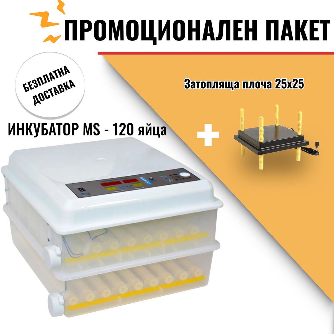 Инкубатор за яйца MS-120 (DC 12V / AC 220V) +Затопляща плоча за пилета MS-25x25
