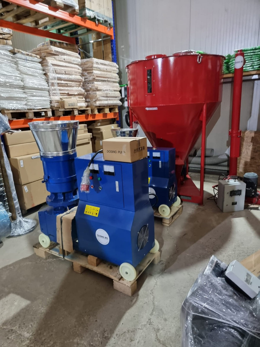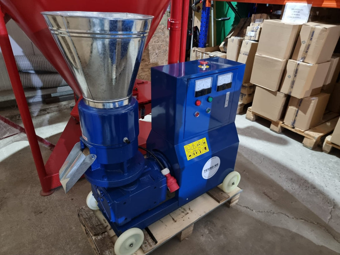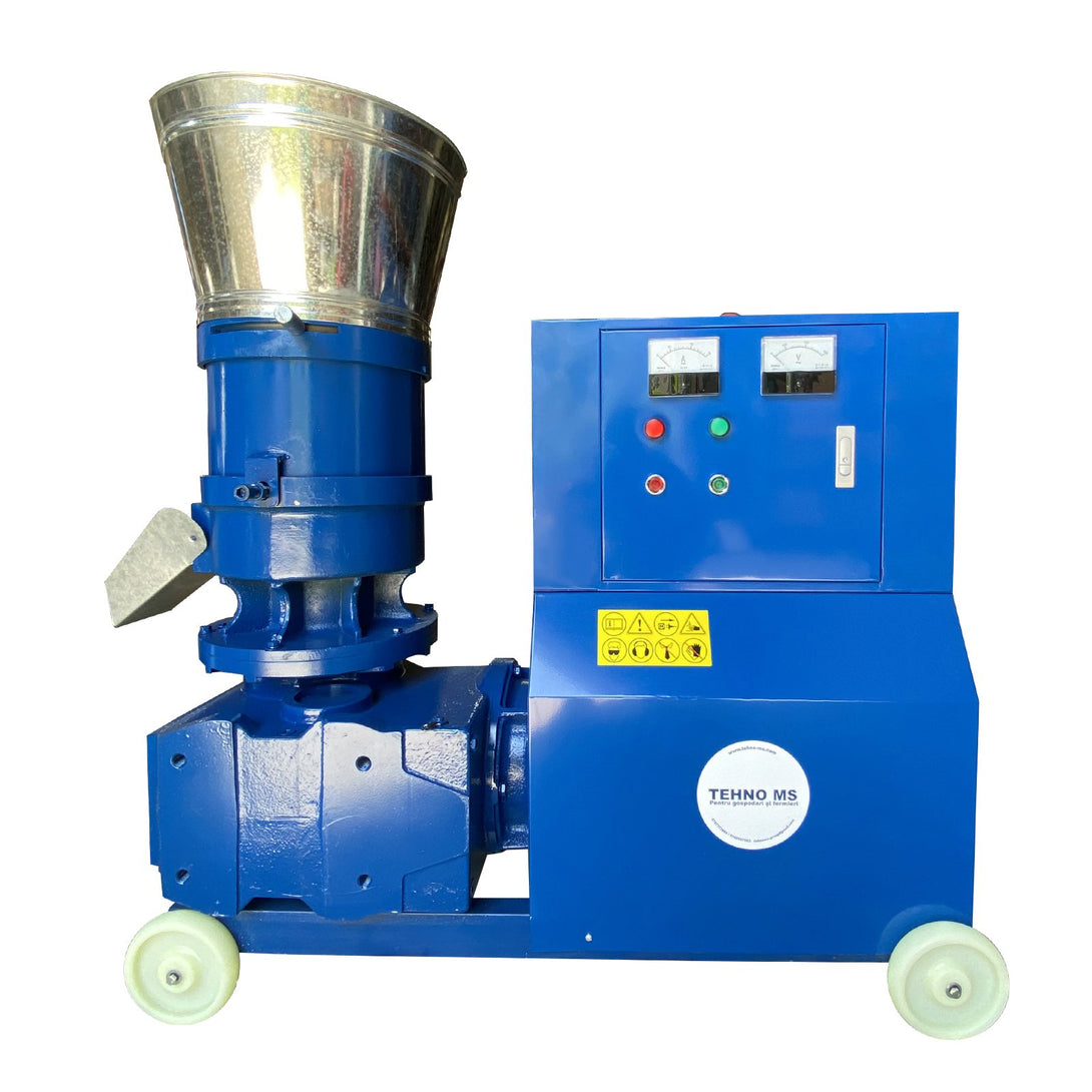 Този продукт е оборудван с: резервоар за захранване, тяло на механизма на пелетиращата машина, щепсел за външно електрическо свързване, захранващ кабел, волтметър, електрическа кутия, амперметър, амперметър, стоп ключ, пусков ключ, електродвигател, транспортно колело, шаси на пелетиращата машина, защита на съединителя на моторизацията, пресоващ валяк, матрица, тяло на редуктора и улей за изхвърляне на пелети.