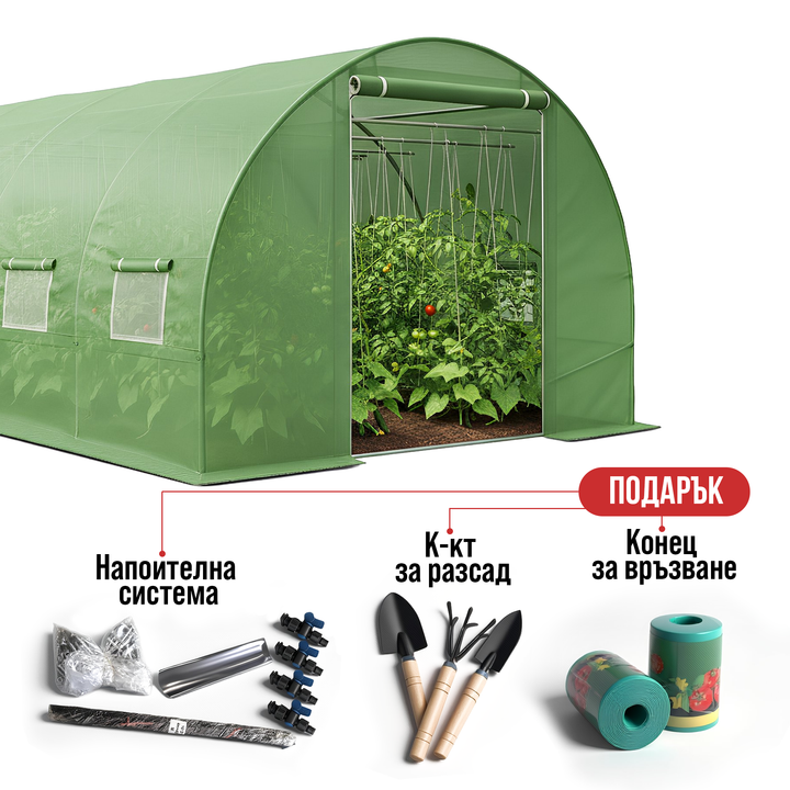 Оранжерия за зеленчуци 4 x 6x 2,30 фолио 180 г/м2: Подарък напоителна система + Конец за връзване + К-кт за разсад