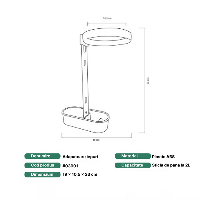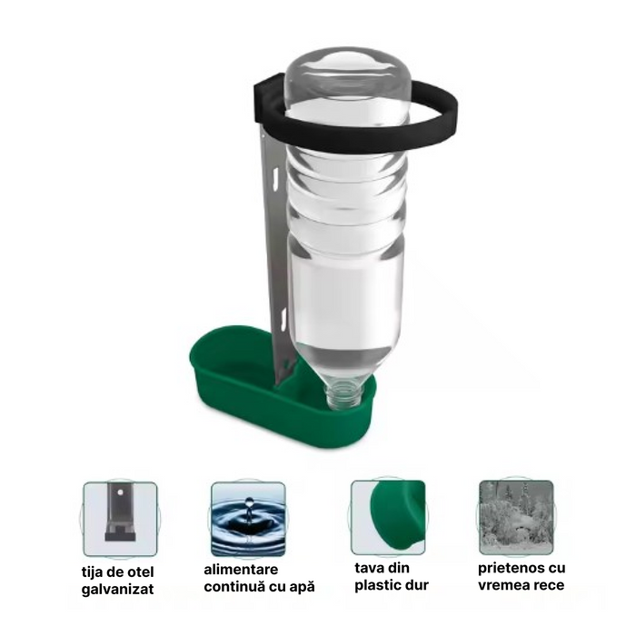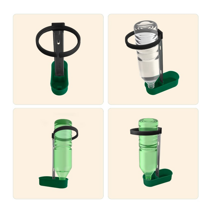 Държачът за пластмасови бутилки е с вместимост до 2 литра и е разположен вертикално надолу с помощта на система, която може да се прикрепи към клетката.