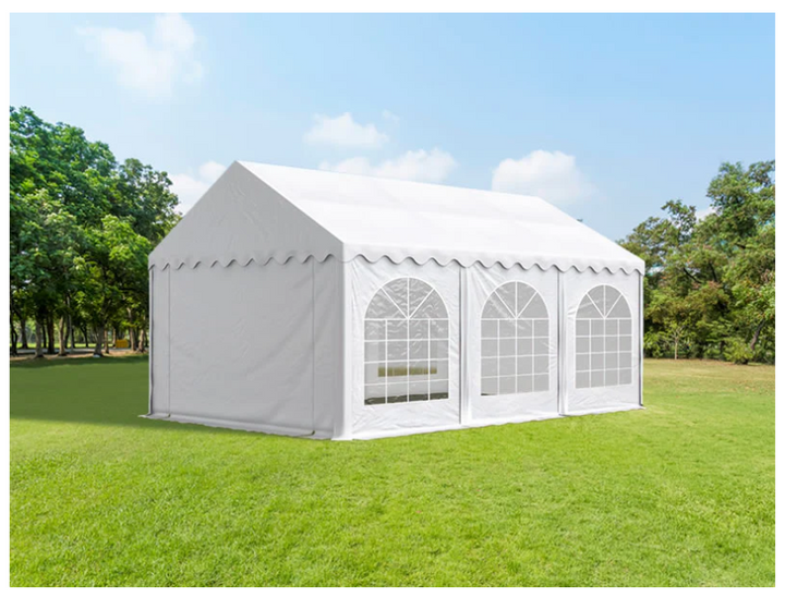 Шатра за събития 4х10 м, лесна за поставяне, с поцинкована стоманена конструкция и здрав PVC брезент 500 г/кв.м, подобен на брезент за камион. Както покривният брезент, така и страничните стени предлагат слънчева защита 80+,