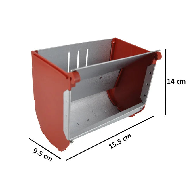 Хранилка за зайци 15 см комплект 10 броя Хранилката за зайци е направена предимно от поцинкована ламарина, а двете страни са от твърда пластмаса. Тя има едно отделение и се монтира към външната страна на клетката, като по този начин се улеснява захранването на резервоара. Също така елиминира отпадъците от фураж и не позволява на животните да я преобърнат. Компонентите...