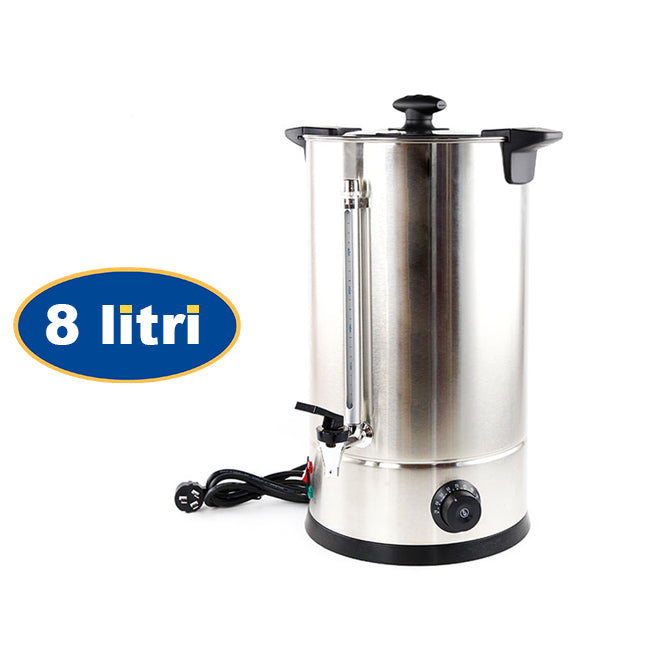 Електрическа кана от неръждаема стомана за напитки 8 литра Електрическа кана за вода, вино и чай. Термостат, регулируем от 30 до 110 градуса по Целзий. ХАРАКТЕРИСТИКИ: Вместимост: 8 литра. Електрическа мощност: 1600 w. Изработена от неръждаема стомана. Предпазен термостат. Индикатор за температурата на водата в резервоара. Време за кипене: около 30 минути. Електрически уреди за приготвяне на греяно вино, вода...