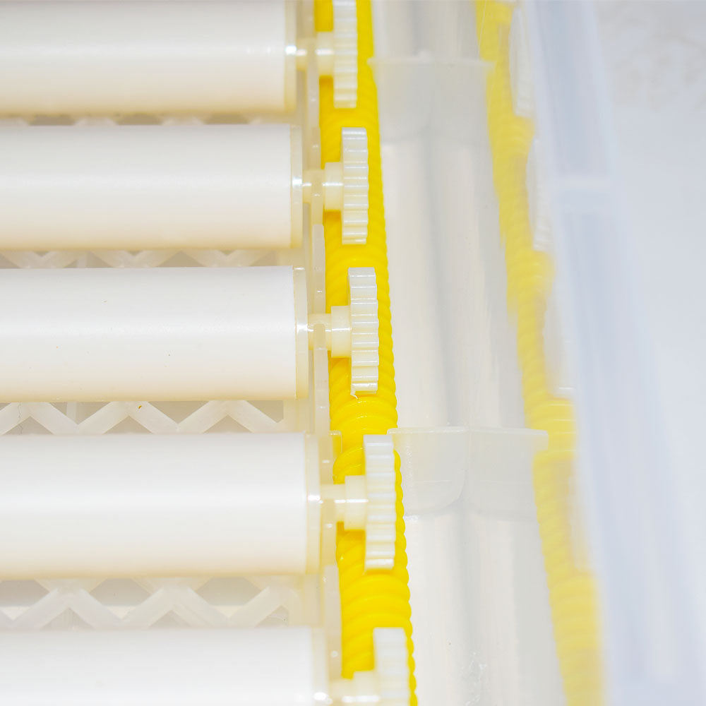 С този инкубатор можете да излюпвате различни видове яйца (кокоши, патешки, гъши, пъдпъдъчи и др.), тъй като можете да промените разстоянието между въртящите се ролки в зависимост от размера на яйцето.