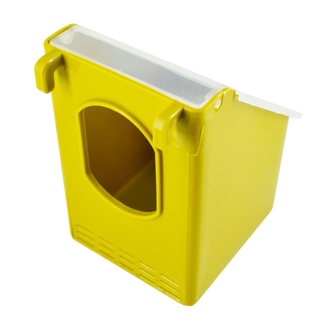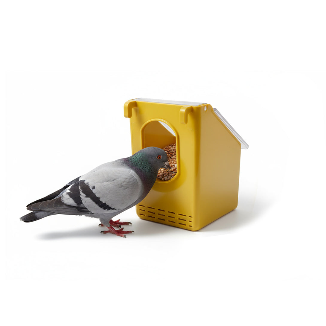 Хранилките за гълъби се монтират лесно на решетката на клетката, а зареждането с фураж става много бързо, като просто се повдигне прозрачният капак на хранилката и се напълни отново.