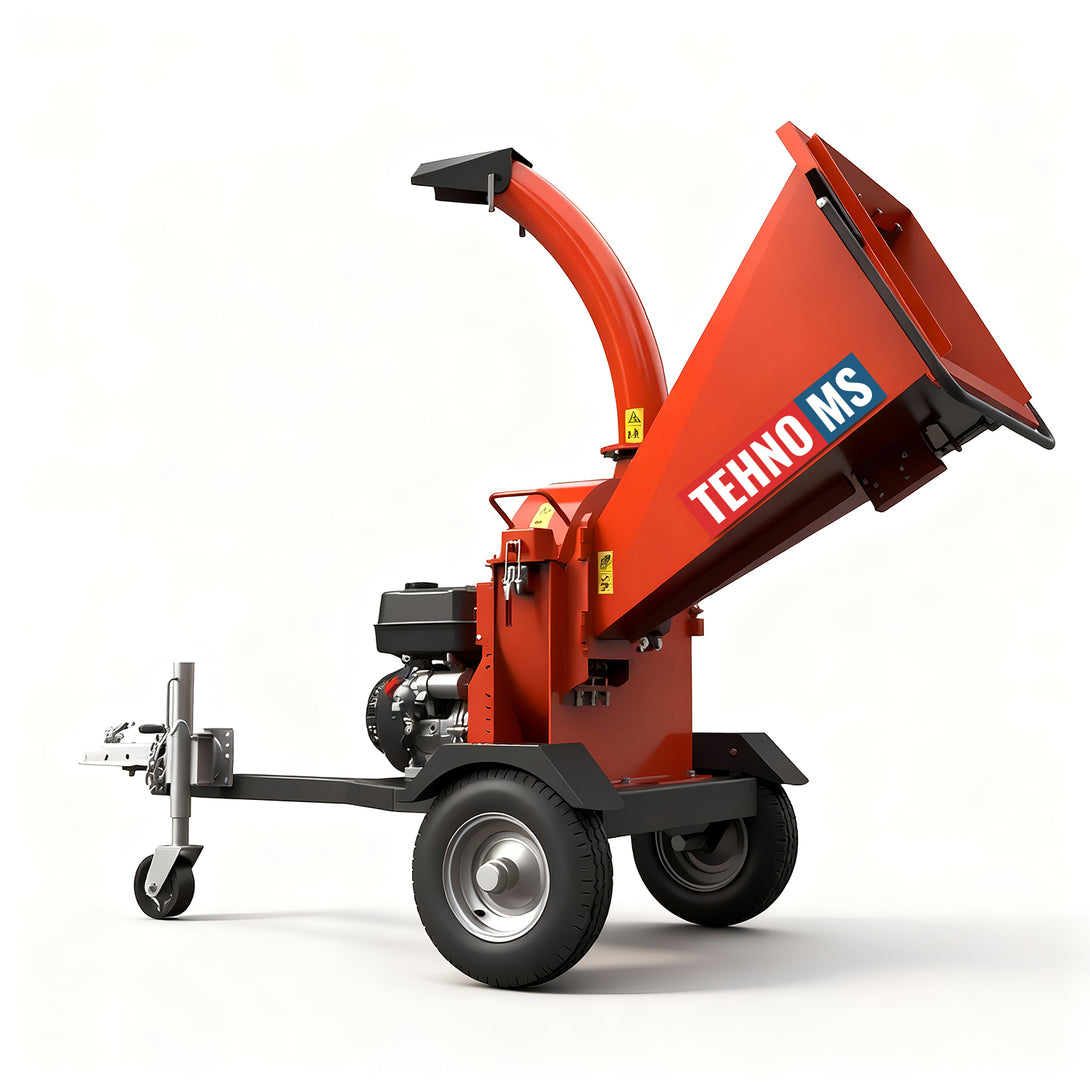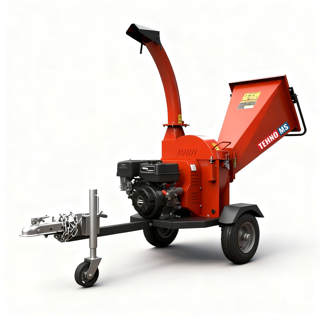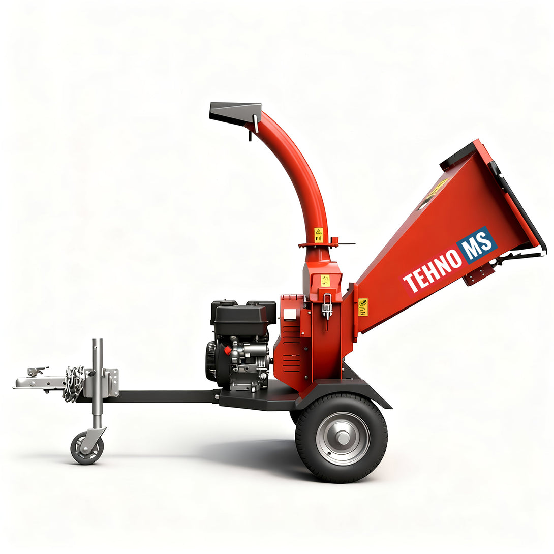 Нашият продукт е оборудван с: захранващ бункер, изпускателен канал, защитна планка, 2 колела, 2 режещи ножа, монтирани на диск, който служи и като маховик, 1 поддържащ нож, бутон за включване/изключване, кука за издърпване, двигател с мощност 15 к.с.и опорна планка на шредера.