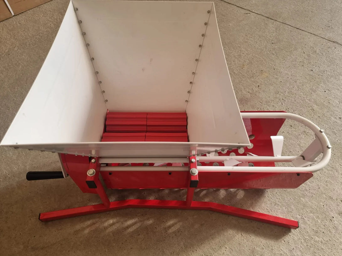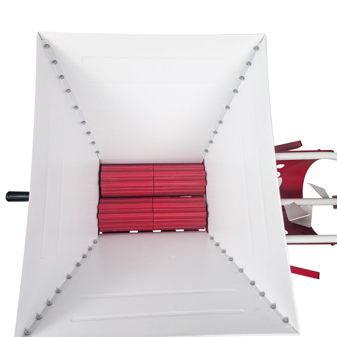 Дробилката се поставя върху съд с вместимост най-малко 50 литра (бъчва), в който се събира смачканото грозде.