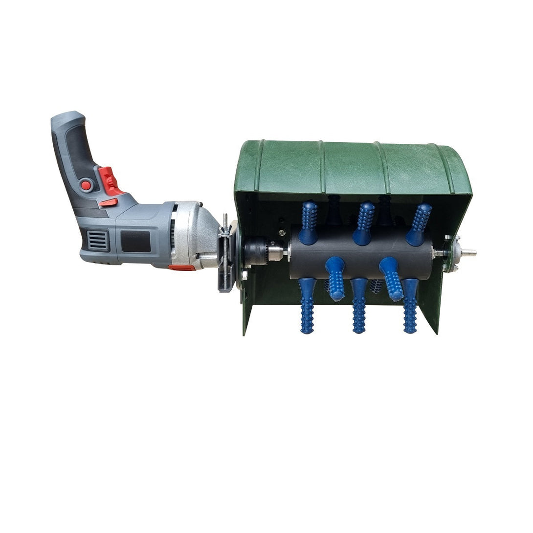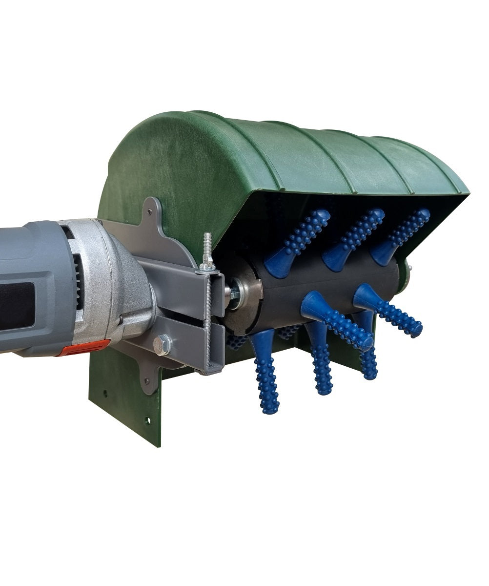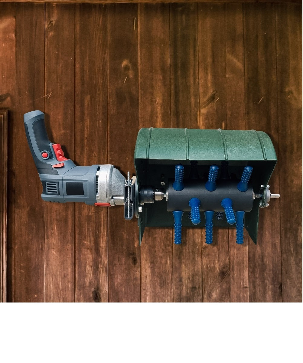 Благодарение на системата за закрепване на гърба на корпуса можете да прикрепите този модел към всяка стена. Заварената ролкова ос е надеждна, тъй като е специално проектирана да държи свредлото в главата на бормашината, осигурявайки стабилност и безопасност за потребителя. При необходимост може да се подменят палци за премахване на перата, монтирани на ролката.