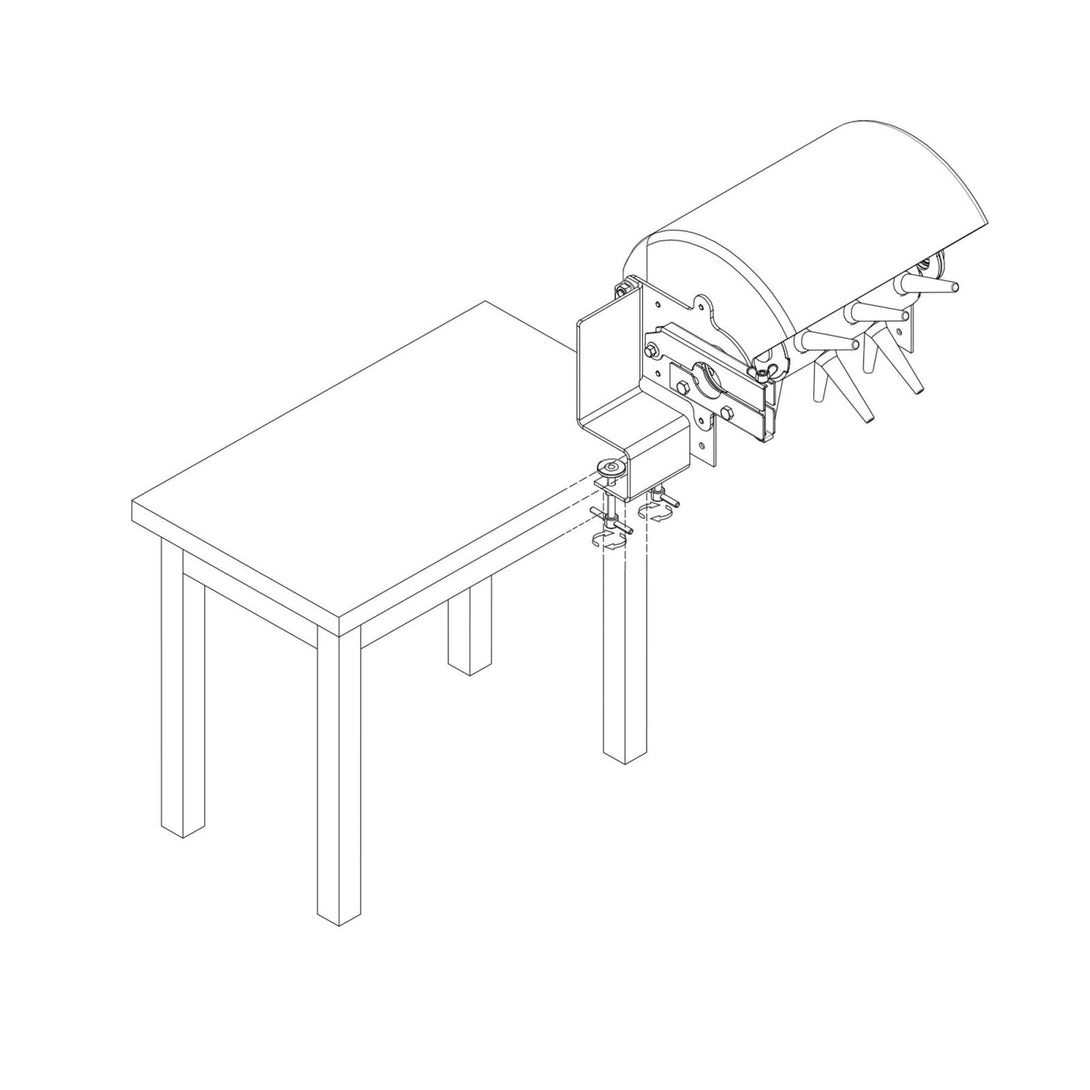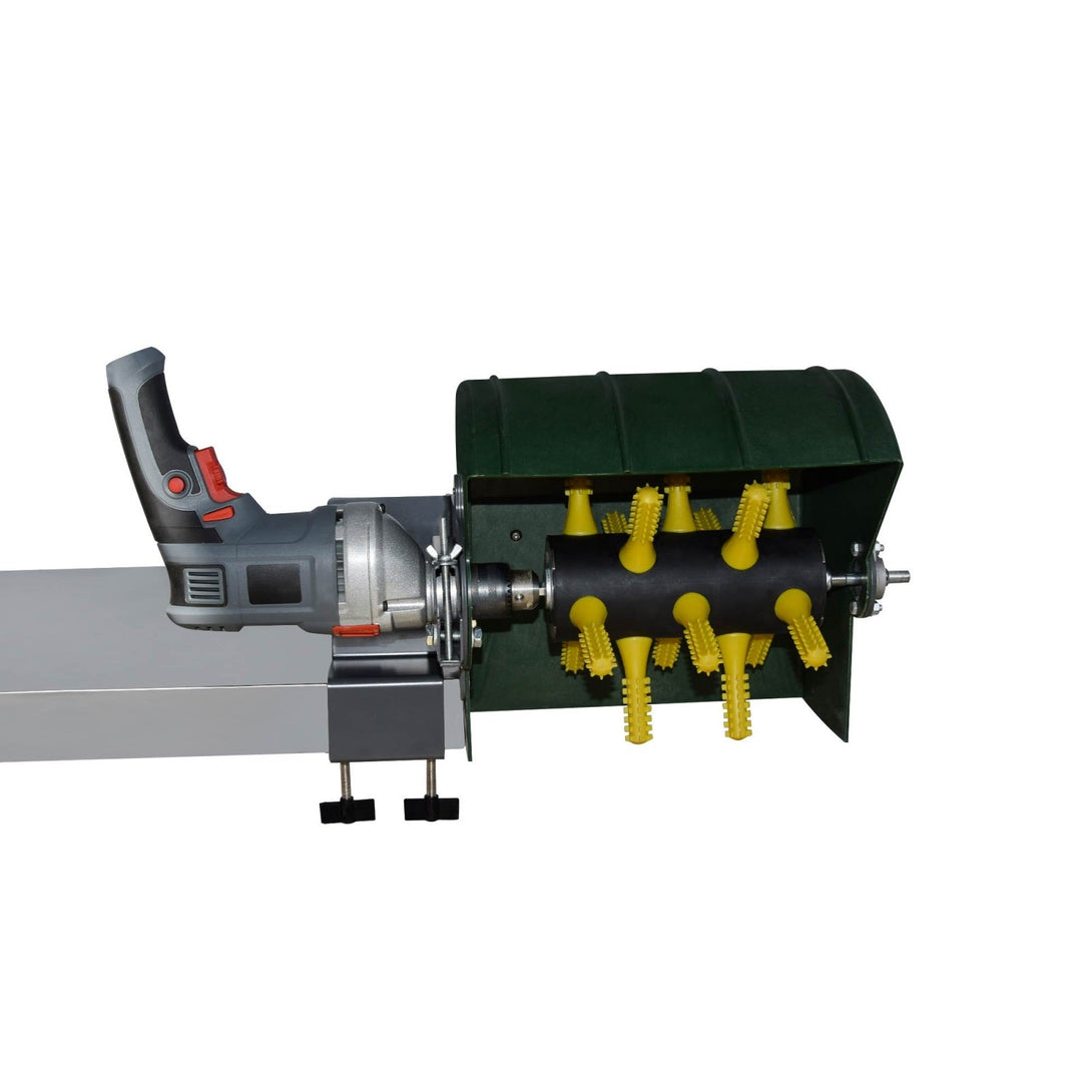 Благодарение на фиксиращата система, отстрани на кутията, можете да прикрепите този модел щипка към всяка равна повърхност (маса). Заварената ролкова ос е надеждна, тъй като е специално проектирана да държи свредлото в главата на бормашината, осигурявайки стабилност и безопасност за потребителя. При необходимост може да се подменят палци за премахване на перата, монтирани на ролката.