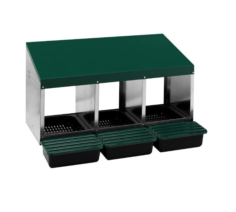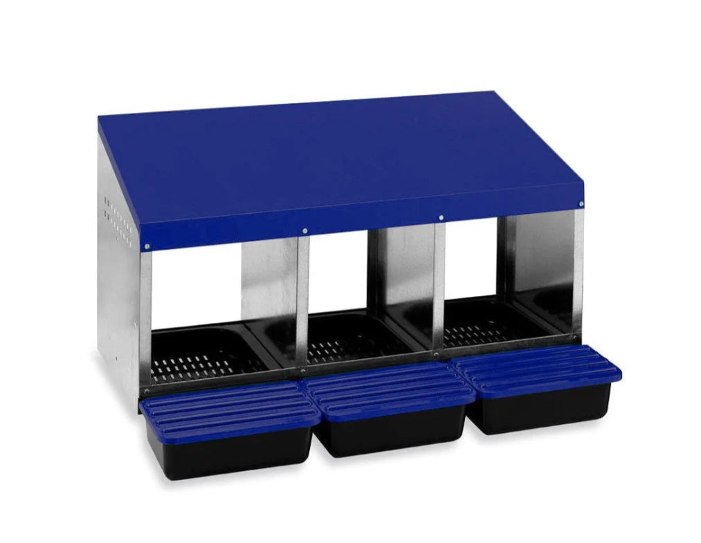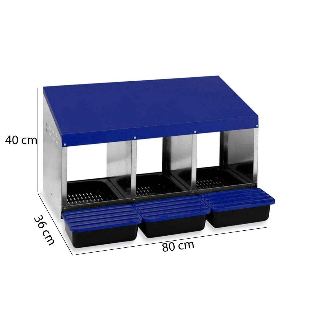 Гнездо за кокошки с 3 отделения Страничните панели, разделителите и покривът са изработени от поцинкована стомана за стабилна и издръжлива структура при сглобяване, а кошниците тип колектор са изработени от пластмаса. След снасянето на яйцата те ще се отвеждат в дъното на гнездото, кокошките нямат достъп до яйцата и не могат да ги изядат, изцапат или счупят! Подвижният дизайн предпазва...
